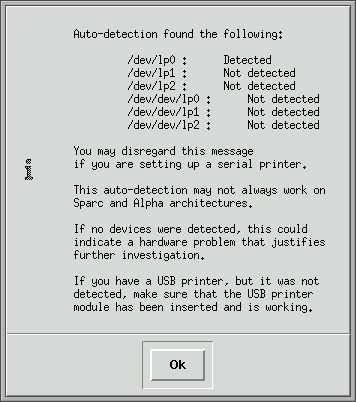 제공한 커널에서 프린터 모듈을 컴파일하므로 자동으로 사용가능한 프린터 포트를 다음 화면과 같이 보여줄 것입니다. 다음과 같은 화면이 나온다면 [OK]버튼을 누릅니다.