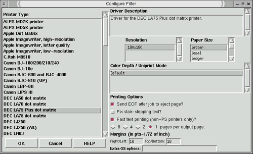 프린터 목록에서 해당하는 기종이 없다면, 가지고 있는 기종과 호환성이 있는 기종을 선택합니다. HP Deskjet시리즈는 대부분 지원을 할 것입니다. Paper Size를 선택합니다. A4전용이라면, A4를 선택합니다. Color Depth/Uniprint Mode에서 원하는 형태를 지정합니다. 프린터 종류에 따라, 형태가 다양하게 나타납니다. 칼러가 지원한다면, Color 모드를 지정해야 칼러를 사용할 수 있습니다. 환경설정이 끝났다면, [OK]버튼을 클릭합니다.