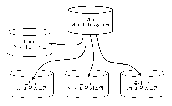 VFS: Diskquotas version dquot_6.4.0 initialized 가상 파일 시스템의 초기화를 말합니다. 가상파일 시스템이라는 것은 다음 그림과 같이 본래의 파일 시스템과 다른 파일시스템간의 중간에서 완충역할을 통해 파일 시스템을 구성하므로써 서로 다른 파일 시스템간에도 파일을 읽거나, 쓸 수가 있도록 하는 리눅스 만의 독특한 파일 시스템입니다. 이 파일 시스템을 통해 윈도우 95/98/NT 나 다른 맥ㅁ, 솔라리스와 같은 운영체제의 파일 시스템을 읽을 수 가 있습니다.