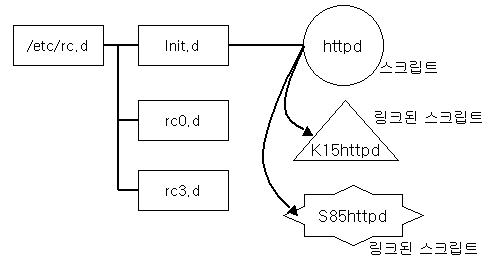 원본 스크립트들은 /etc/rc.d/init.d에 존재하면서 run-level 3에 링크되는 것을 보여주고 있습니다. 예제는 웹 데몬 httpd가 run-level 3에 S85httpd 이름으로 링크 되어 있는 것을 볼 수가 있습니다. S : 시작 85 : 85번째 httpd : 데몬이름 또한 run-level 0에 15번째로 링크되어 있는 것을 볼 수가 있습니다. 만약 여러분이 부팅을 하면서 run-level 3으로 부팅을 하면, 웹데몬 httpd는 85번째로 실행이 됩니다. 그리고 다시 여러분이 리눅스 박스를 종료시키면 run-level 0이므로, 15번째로 웹데몬 httpd가 종료를 하게 됩니다.