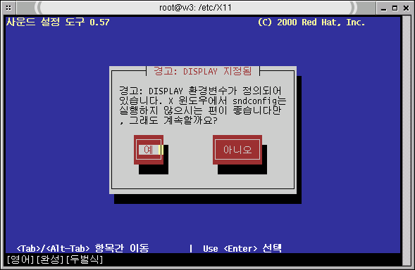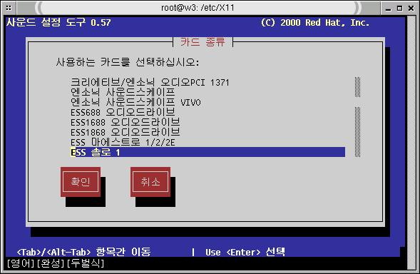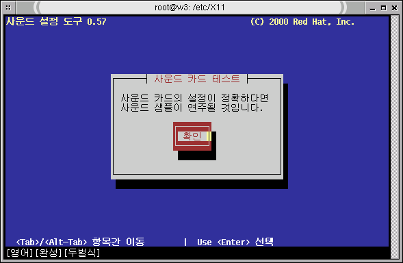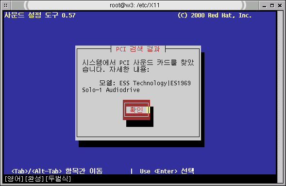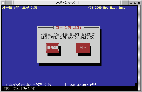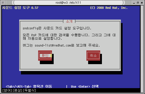 여기서 sndconfig 가 자동으로 인식한 사운드 카드의 종료가 자신이 사용하는 사운드 카드와 다르더라도 우선은 '확인'을 누릅니다.