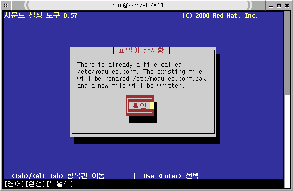 리눅스 7.0 이상에서는 /etc/modules.conf로 변경되었습니다. 그러므로, /etc/modules.conf.bak라는 백업파일이 만들어집니다. 리눅스 6.2 이하에서는 /etc/isapnp.conf와 /etc/conf.modules를 사용합니다. 그러므로, 기존에 설정되어 있던 /etc/isapnp.conf 파일과 /etc/conf.modules 파일을 백업한다는 것을 사용자에게 알려주는 메시지가 나올 수 있습니다. 각각의 파일은 /etc/isapnp.conf.bak 과 /etc/conf.modules.bak 파일로 백업됩니다. 여기서 '확인'을 누르면 다음과 같은 화면이 나타납니다.