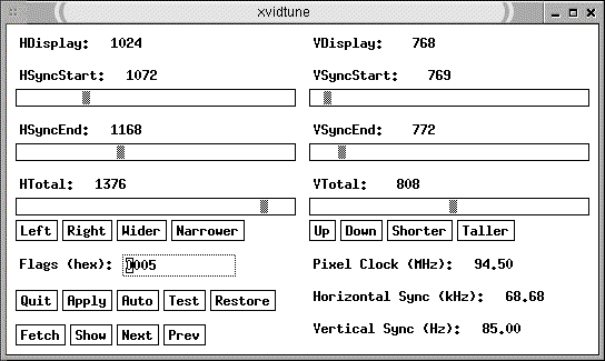 10. 모니터 조정을 위한 xvidtune 추가로 xvidtune라는 프로그램을 살펴볼 필요가 있습니다. 이 프로그램은 현재 실행되고 있는 X윈도우의 설정을 보여주고, 비디오 모드 설정을 변경시켜 보는 기능을 가지고 있습니다. X윈도우의 해상도를 변경하면 모니터의 가시 영역과 X윈도우 화면이 일치하지 않는 경우가 생깁니다. 이런 경우 xvidtune을 사용하여 모니터의 설정을 사용자의 기호에 맞게 변경할 수 있습니다. # xvidtune 이 프로그램은 XF86Config의 Section Monitor의 Modeline 항목과 관련이 있습니다. 그러나 이프로그램으로 작업한 내용은 XF86Config 파일에 반영되지는 않습니다. 변경된 내용을 반영하기 위해서는 xvidtune 프로그램에서 작업한 수치를 XF86Config에 직접 적어주면 됩니다. 다음은xvidtune프로그램을 실행한 화면입니다.