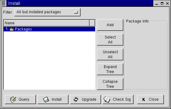 우측의 Add 버튼은 패키지를 더하고 싶을 때 사용한다. 예를 들어 배포판 시디롬이 /mnt/cdrom에 마운트되어 있다면, /mnt/cdrom/RedHat/RPMS을 추가해 주면 될 것이다. 그러면 새로운 패키지들이 나타날 것이다.
