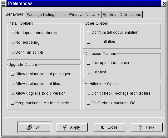 설치하고자 하는 패키지를 선택했다면, 하단의 버튼을 이용해서 설치하면 된다. Gnome-RPMS의 Operations->Preference는 Gnome-RPM에 대한 환경설정을 할 수 있는 창이다. 예를 들어 패키지 설치나 삭제를 할 때 의존성 문제가 생기면, 아래 화면과 같이 선택한 후 설치 또는 삭제하면 된다.