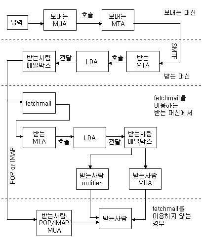 위 과정을 그림으로 표현하면 그림과 같다. 그림에서 페치메일을 이용하는 경우가 있지만, 이는 서버측이 아니라 클라이언트에서 이용하는 것이므로 본 글에서는 다루지 않는다. 리눅스의 /var/spool/ 디렉토리를 보면 두 개의 mqueue 와 mail이라는 디렉토리가 있는 것을 볼수 있다. mqueue는 MUA에서 메일을 보낼 때, 우선 이 mqueue(메일 큐라 함)에 메일이 저장되고, MTA는 이를 전달한다. mail이라는 디렉토리를 보면 각 사용자에 따른 파일이 존재하는데 이것이 메일박스이다.