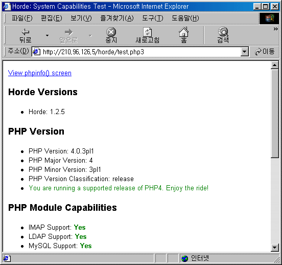 다섯 개의 섹션으로 구분되어 있는데, Horde Versions, PHP Module Capabilities, PHPLIB Configuration, Miscellaneous PHP Settings이다. 정상적으로 동작한다면 녹색으로 YES라고 표시가 되고, 동작하지 않거나 잘못 설정된 부분이 있다면 빨간색으로 No라고 표시되며, 그에 대한 간단한 경고 메시지가 뜬다. PHP Module Capabilities에서 IMAP Support:Yes가 아닌 No라고 한다면, IMP를 사용할 수 없다. 이것은 반드시 Yes라고 표시가 되어야 한다. php 3.0.16을 사용했을 때 실패하면, php4를 사용해야 한다. PHP Configuration에서 Click here to test PHPLIB for Horde를 클릭하면 아래의