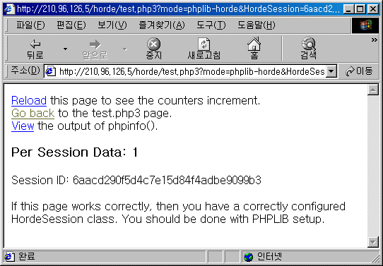 MySQL의 루트 패스워드를 입력하면, IMP를 위한 데이터베이스 및 테이블이 자동으로 만들어진다. 기본적인 환경에 대한 설정은 끝났다. 지금까지 한 것이 제대로 되었는지 확인하기 위해 horde/test.php3이라는 것이 제공된다. 웹 브라우저의 URL에 http://localhost/horde/test.php3이라고 입력해 보자. 그럼, 아래와 같은 화면을 볼수 있을 것이다.