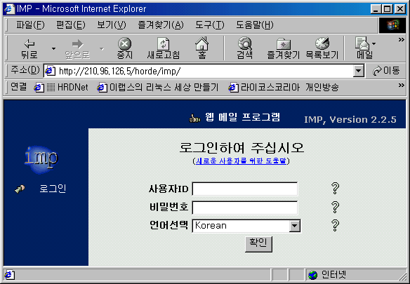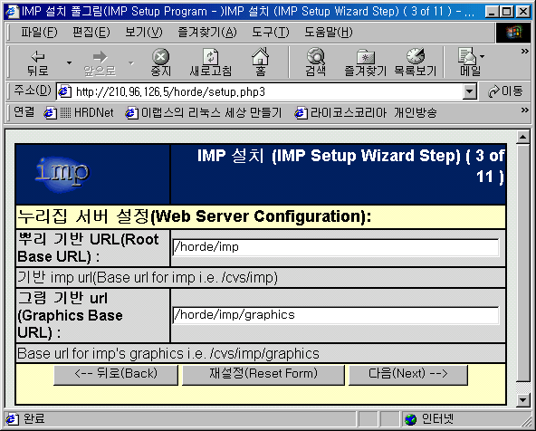 horde(phplib)를 설치했고, localhost/horde/test.php3에서 모든 것이 정상적으로 동작한다면 이제 IMP를 설치하면 된다. imp-2.2.5.tar.gz를 horde/아래에서 압축을 푼다. # tar xvzf imp-2.2.5.tar.gz