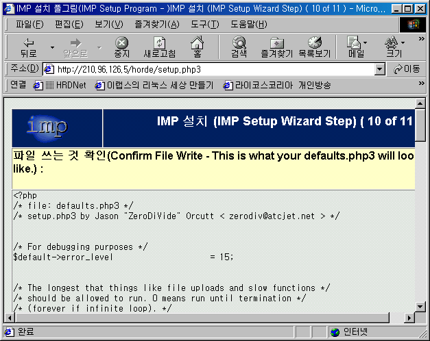 [root@w3 horde]# horde-1.2.5.tar.gz의 한글 로케일 파일 오류가 정상적으로 실행되지 않을 수도 있는데, 그 경우 horde/locale/kr/setup.lang에서 아래와 같이 편집하면 된다.