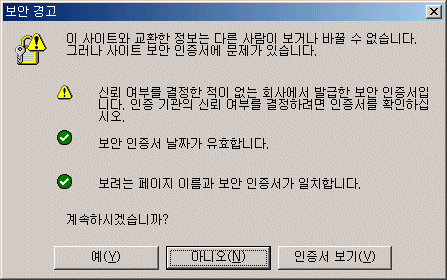 인증서를 받은 다음 'httpd.conf'에서 개인키와 인증서를 지정해야 한다. 위에서 이미 언급한 'SSLCertificateFile'과 'SSLCertificateKeyFile'지시어를 이용하게 된다. SSLCertificateFile /usr/local/httpd/conf/ssl.crt/server.crt SSLCertificateKdyFile /usr/local/httpd/conf/ssl.key/server.key 다음 'apachectl'을 통해 웹서버를 시작하게 되면 SSL을 이용한 웹서버가 작동한다. [root@www src]# /usr/local/httpd/bin/apachectl startssl Apache/1.3.22 mod_ssl/2.8.5 (Pass Phrase Dialog) Some of your private key files are encrypted for security reasons. In order to read them you have to provide us with the pass phrases.