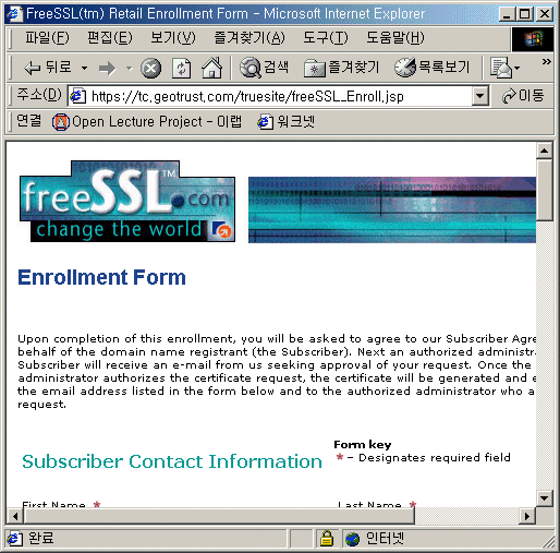 여기서 인증된 기관에 직접 요청을 해 인증서를 받는 부분에 대해 언급하고자 한다. 베리사인에서는 2주 동안 사용해 볼 수 있는 테스트용 인증서를 발급해 주고 있으며, FreeSSL이라는 곳에서는 인증서를 처음에 무료로 발급해 주고 있다. 재발급시에는 물론 약간의 비용을 지불하게 되고, 브라우저가 인식할 수 있는 것도 70%이상이므로 테스트하는 역할로 충분하다. 1년동안 무료로 사용할 수 있으며, 128비트를 지원하고 있다. 인터넷 익스플로러 5.01 이상이면 사용하는데 문제가 없을 것이다. 자세한 것은 홈페이지(www.freessl.com)을 참고하기 바라며, 인증서를 신청하는 폼은 다음<화면2>와 같다.