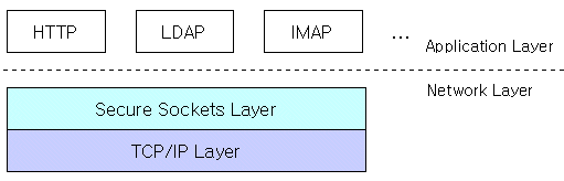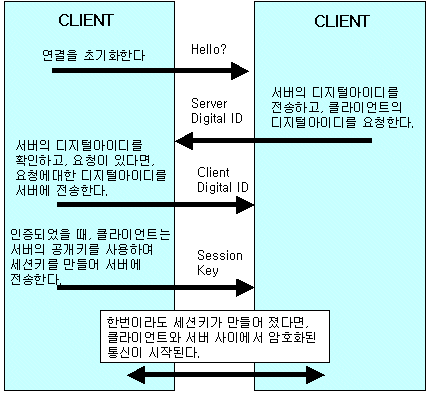 현재 IETF(Internet Engineering Task Force)는 SSL을 기반으로 Transport Layer Security(TLS) 표준을 만들었으며, 이것이 TLS 프로토콜1.0이다. 아파치 SSL또한 TLS을 지원하고 있다. SSL프로토콜은 신뢰성을 기반으로 하는 TCP/IP와 상위의 애플리케이션 레이어 사이에 위치하고 있다.(그림1) <그림1> SSL의 동작 (그림1)의 SSL은 TCP/IP와 상위레벨 애플리케이션 사이에서 동작한다. 이프로토콜은 서버와 클라이언트 각기 다른 인증, 세션키의 성립 등에 대해 다양한 암호화 알고리즘 또는 암호(ciphers)를 지원한다. 이것은 곧 '확장성'을 의미하는 것으로서 미래에 나올 수 있는 새로운 암호키나 대단위 암호화 방법 등에 적용할 수 있는 프레임 워크(framework)를 지원하게 된다. SSL이 이루어진 접속에서는 클라이언트와 서버간의 모든 정보가 클라이언트의 브라우저에 의해 암호화돼 전송되고, 내용을 받게되는 소프트웨어에 의해 해독이 이루어지므로 기밀서을 제공해 준다. 이러한 기밀성은 중요한 데이터 전송에 있어서는 중요한 부분이며, 더블어 중간에 데이터의 내용이 변경되어지는 여부 또한 알 수 있다. SSL은 'SSL Record Protocol'과 'SSL Handshake Protocol'로 이루어져 있다. 'SSL Record Protocol'은 데이터 전송에 사용될 포맷에 대한 정의이며 'handshake protocol'은 SSL 레코드 프로토콜을 이용해 처음 SSL접속이 이뤄졌을 때 클라이언트와 서버사이에 여러 관련 메시지들을 주고 받게 된다. SSL 프로토콜은 후에 설명할 공개키와 대칭키 암호화 방법을 혼합해 사용하고 있다. 대칭키는 공개키보다 훨씬 빠르나, 공개키는 좀더 나은 인증 방법을 제공해 준다. SSL세션이 이루러지기 전에 'SSL Handshake'를 통해 메시지를 교환하는데 이러한 것들은 서버가 공개키 방법을 이용해 클라이언트 인증을 허용하게 되고 클라이언트와 서버는 세션 동안에 대칭키를 이용해 빠른 속도로 암호, 해독 등을 수행하게 된다. 이것을 단계별로 설명한다면 다음과 같다.