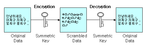 <그림2> SSL의 단계별 과정 2. 암호에 대한 기본적인 지식 SSL은 보안 프로토콜로서 대칭키, 비대칭키 등의 암호화 기술이 사용된다. 최소한 이러한 방법에 대해서 알아두고 SSL을 적용해 본다면, SSL의 이해에 도움이 될 것이다. 암호란 일반적인 데이터 내용을 변형해 누군가 가로챈다 해도 어떠한 내용인지 알 수가 없도록 변경해 데이터의 내용을 외부로부터 지키는 것이다. 이와 반대로 암호화된 데이터를 읽을 수 있도록 원형의 상태로 복구하는 것을 해독이라 한다. 이러한 암호화 알고리즘은 'cipher'라 불리며, 수학적인 기능들을 사용하고 있다. 여기서는 많이 사용하는 방법중의 하나인 대칭키와 공개키에 대해 잠깐 알아보고 넘어가도록 하겠다. 대칭키(Symmetric-key)란 하나의 키(key)를 통해 암호화 해독을 수행하는 것이다. 암호와 해독에 있어서 상당히 빠르므로 빠른 시간을 필요로 하는 곳에서는 효율적으로 사용될 수 있으며, 암호과정은 <그림3>과 같다. DES(Data Encryption Standard)는 이 대칭키를 이용하고 있는 방법중의 하나로 널리 사용되고 있다. <그림3> Symmetric-key encryption 그러나 대칭키는 키를 안전하게 분배하는 부분이 고려돼 있지 않다. 대칭키 암호 구성은 송신자오 ㅏ수신자가 같은 암호키를 가지고 있어야 하므로, 비록 데이터가 암호화돼 안전하게 전송됐다 하더라도 이때 사용되어진 키를 안전하게 전달하는 것이 큰 과제로 남게 된다. 이런 키분배의 문제를 해결하기 위해 나온 방법 중의 하나가 공개키(public key)다. 공개키 암호문은 비대칭키를 사용한 것으로 하나의 키를 암호에 사용하면 다른 하나의 키는 해독에 사용하는 것으로 다음과 같이 나뉘어진다.