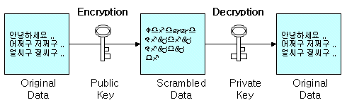 공개키는 외부에 공개되는 키이지만 개인키는 외부에 노출 되지 않도록 안전하게 보관돼야 한다. 참고로 공개키를 사용해 수학적으로 개인키를 알아내는 것은 거의 불가능하다. 누군가 외부에 공개된 공개키(public key)를 이용해 암호화를 하면 그것을 해독할 수는 없으며, 오로지 그정보를 해독할 수 있는 사람은 그 공개키의 소유자 개인키에 의해서만 해독할 수 있다. 이렇게 공개키 암호화를 이요하면 안전하게 메시지를 교환하기 위해 사전에 협의와 같은 것이 필요 없다는 장점을 가지고 있다. 대칭키의 단점인 송신자와 수신자가 같은 키를 가지고 있어야 하는 요소가 제거된 것이다. 모든 정보는 공개키를 이용해 암호화하게 되고 개인키는 오로지 자기 자신만이 알고 있으면 된다. 공개키 암호시스템을 사용한 것들은 RSA, DSA 같은 것들이 있다. 공개키의 과정을 그린 것은 <그림4>와 같다. <그림4> Public-key encryption 암호 알고리즘에서는 키의 값에 의해서 얼마나 안전한가가 달라진다. 키 자체는 일반적으로 매우 큰 값을 가지고 있다. 키의 값이 크면 클수록 안전하게 되지만, 상대적으로 속도 저하는 감수해야 한다. 여기서 알아본 대칭키와 공개키의 사이즈는 대조적이다. 대칭키의 80비트 키 사이즈는 공개키의 1024비트와 동등하며, 128비트 키사이즈는 공개키의 3000비트와 같은 강도를 가지고 있다. 다시말해 큰값의 키인가, 얼마나 안전한가는 사용하는 암호 알고리즘에 따라 달라지는 것이다. 또한 큰값의 키를 사용하게 되면 해독하기 위해서 많은 시간이 소요되게 되어 오랫동한 안전하게 되겠지만, 성능도 고려해야 한다. 그렇기 때문에 올바른 사이즈의 키를 선택해야 할 것이다. 하지만 미래에 더 빠른 속도의 컴퓨터가 나온다면 안전하지는 못하게 될 것이다. 56비트의 대칭키가 안전하다고 믿었던 시기가 있어지만 지금은 그렇지 못하기 때문이다. 공개키 암호화의 큰 장점 중의 하나는 전자서명(Digital Signatures)의 방법을 제공해 줄 수 있다는 점이다. 전자 서명은 수신자가 받은 정보가 올바른 사용자에 의한 것인지 증명할 수 있다. 그러므로 공개키 전자서명은 인증 이외에 추가적으로 데이터 무결성에 대한 것까지 제공하게 된다. 또한 전자서명은 부인 방지 기능을 가지고 있다. 이것은 송신자가 정보를 보내지 않았다고 부인할 수 없도록 방지하는 것이다. 전자서명은 일반적으로 우리가 사용하는 서명과도 같은 것으로 전잦거으로 표현한 것이지다. 사람의 손으로 쓴 서명은 쉽게 조작이 가능하지만, 전자서명은 위조하는 것이 거의 불가능하다. 여기서 이와 같은 암호화 방법으로 사용하게 된다면 데이터의 양이 많을 경우 처리하는데 있어서 느리다는 문제점을 가지게 된다. 왜냐하면 원래 데이터의 2배 이상 사이즈로 커지는 문제를 가지고 있으므로 이에 대한 해결책으로 'one-way hash functions'기능을 사용한다. 이것을 사용하게 되면 입력되는 데이터가 아무리 많다고 해도 출력되는 내용의 사이즈는 160비트와 같이 제한된다. 만약 이 'hash'된 정보가 한비트라도 바뀌게 되면 완전히 다른 결과물이 나오기 때문에 효율적으로 사용할 수 있다. MD5, SHA(Secure Hash Algorithm)등이 있다.