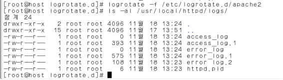 14. 아파치 설치 마무리 1. 아파치 Log Lotate 추가하기 아파치 로그는 하나의 파일에 저장을 하면 사이즈가 계속 커져 속도를 저하시킨다. 로그를 잘라서 저장하게 하는 서비스가 Loglotate이다. # cd /etc/logrotate.d # vi apache2 /usr/local/httpd/logs/*log { missingok notifempty sharedscripts postrotate /usr/local/httpd/bin/apachectl reload > /dev/null 2 > &1 || true endscript } # logrotate -f /etc/logrotate.d/apache2