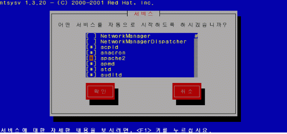 2. Runlevel 스크립트 추가하기 자동데몬시작을 위해 runlevel 스크립트를 추가해보자 # cd /etc/init.d # vi apache2 #!/bin/bash # # Startup script for the Apache Web Server # # chkconfig: - 85 15 # description: Apache is a World Wide Web server. It is used to serve \ # HTML files and CGI. # processname: httpd # pidfile: /usr/local/httpd/logs/httpd.pid # config: /usr/local/httpd/conf/access.conf # config: /usr/local/httpd/conf/httpd.conf # config: /usr/local/httpd/conf/srm.conf # Source function library. . /etc/rc.d/init.d/functions # This will prevent initlog from swallowing up a pass-phrase prompt if # mod_ssl needs a pass-phrase from the user. INITLOG_ARGS="" # Path to the apachectl script, server binary, and short-form for messages. apachectl=/usr/local/httpd/bin/apachectl httpd=/usr/local/httpd/bin/httpd prog=httpd RETVAL=0 # Find the installed modules and convert their names into arguments httpd # can use. moduleargs() { moduledir=/usr/local/httpd/modules moduleargs=` /usr/bin/find ${moduledir} -type f -perm -0100 -name "*.so" | env -i tr '[:lower:]' '[:upper:]' | awk '{\ gsub(/.*\//,"");\ gsub(/^MOD_/,"");\ gsub(/^LIB/,"");\ gsub(/\.SO$/,"");\ print "-DHAVE_" $0}'` echo ${moduleargs} } # The semantics of these two functions differ from the way apachectl does # things -- attempting to start while running is a failure, and shutdown # when not running is also a failure. So we just do it the way init scripts # are expected to behave here. start() { echo -n $"Starting $prog: " daemon $httpd # daemon $httpd `moduleargs` $OPTIONS RETVAL=$? echo [ $RETVAL = 0 ] && touch /var/lock/subsys/httpd return $RETVAL } stop() { echo -n $"Stopping $prog: " killproc $httpd RETVAL=$? echo [ $RETVAL = 0 ] && rm -f /var/lock/subsys/httpd /usr/local/httpd/logs/httpd.pid } # See how we were called. case "$1" in start) start ;; stop) stop ;; status) status $httpd ;; restart) stop start ;; condrestart) if [ -f /usr/local/httpd/logs/httpd.pid ] ; then stop start fi ;; graceful|help|configtest) $apachectl $@ RETVAL=$? ;; *) echo $"Usage: $prog {start|stop|restart|condrestart|status|fullstatus|graceful|help|configtest}" exit 1 esac exit $RETVAL 아파치를 재시작해보자 # /usr/local/httpd/bin/apachectl stop # /etc/init.d/apache2 stop # /etc/init.d/apache2 start runlevel에 추가하기위해 아래와 같이 체크한다. # chkconfig --add apache2 # ntsysv