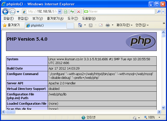 4. PHP 설치하기 가. 다운받기 해당 사이트(http://www.php.net)에서 다운 받으세요 나. 소스 컴파일 # tar xvfz php-5.4.0.tar.gz # cd php-5.4.0 # ./configure —prefix=/web/php --with-apxs2=/web/httpd/bin/apxs --with-mysql=/web/mysql --disable-debug # make # make install 다. 환경설정 및 마무리 PHP 환경설정 파일을 복사한다. # cp php.ini-production /web/php/lib/php.ini # cd /web/php/lib # vi php.ini ... short_open_tag = Off <- On으로 수정한다. ... 아파치 웹서버에 PHP모듈 추가하기 위해 아래와 같이 설정을 추가한다. # cd /web/httpd/conf/extra # vi httpd-php5.conf <IfModule !mod_php5.c> LoadModule php5_module modules/libphp5.so </IfModule> <IfModule mod_mime.c> AddType application/x-httpd-php .php .php3 .phtml AddType application/x-httpd-php-source .phps </IfModule> # cd /web/httpd/conf # vi httpd.conf .... 마지막줄에 아래와 같이 추가한다. # PHP include conf/extra/httpd-php5.conf PHP 설치확인을 위해 아래 파일을 홈페이지 홈디렉토리에 만든다. info.php라는 파일로 다음을 작성하자. # cd /web/httpd/htdocs # vi info.php <? phpinfo(); ?> 아파치 데몬을 재시작한다. # /web/httpd/bin/apachectl stop # /web/httpd/bin/apachectl start 웹부라우저를 띄우고 http://localhost/info.php를 주소에 입력한다.