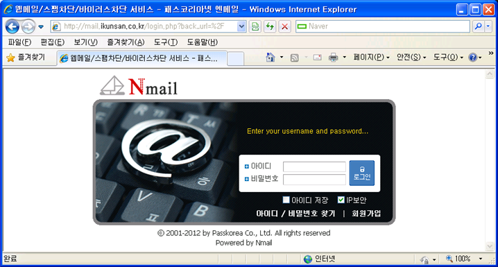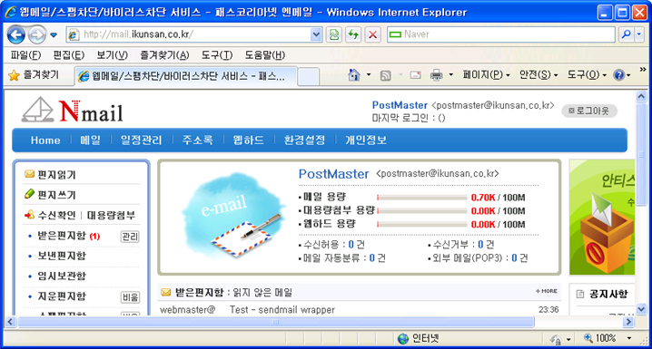 # ./configure --prefix=/web/php --with-apxs2=/web/httpd/bin/apxs --with-mysql=/web/mysql --disable-debug --enable-mbstring --enable-mbregex --with-iconv # make # make install # ls php.ini* php.ini-recommanded # cp php.ini-파일명 /web/php/lib/php.ini # cd /web/php/lib # vi php.ini ... short_open_tag = Off <- On으로 수정한다. ... 아파치 웹서버에 PHP모듈 추가하기 위해 아래와 같이 설정을 추가한다. # cd /web/httpd/conf/extra # vi httpd-php5.conf <IfModule !mod_php5.c> LoadModule php5_module modules/libphp5.so </IfModule> <IfModule mod_mime.c> AddType application/x-httpd-php .php .php3 .phtml AddType application/x-httpd-php-source .phps </IfModule> # cd /web/httpd/conf # vi httpd.conf // 중간쯤에 아래와 같이 수정한다. <IfModule dir_module> DirectoryIndex index.html index.php </IfModule> .... 마지막줄에 아래와 같이 추가한다. # PHP include conf/extra/httpd-php5.conf PHP 설치확인을 위해 아래 파일을 홈페이지 홈디렉토리에 만든다. info.php라는 파일로 다음을 작성하자. # cd /web/httpd/htdocs # vi info.php <? phpinfo(); ?> 아파치 데몬을 재시작한다. # /web/httpd/bin/apachectl stop # /web/httpd/bin/apachectl start 다. 확장 모듈 설치 ■ mailparse 설치 # export PATH=$PATH:/web/php/bin # pecl channel-update pecl.php.net # pecl download mailparse # tar xvfz mailparse-2.1.6.tgz # cd mailparse-2.1.6 # phpize # ./configure # make # make install ■ PHP ioncube 모듈을 설치합니다. 모듈이 설치되는 곳은 아래와 같이 확인한다. no-debug-non-zts-00000000 뒤의 날짜는 다를 수 있다. # ls /web/php/lib/php/extensions/ no-debug-non-zts-20060613 아래 사이트에서 직접 다운받아 PHP extension directory 로 복사후 설치를 시작해야 합니다. http://www.ioncube.com/loaders.php # wget http://downloads2.ioncube.com/loader_downloads/ioncube_loaders_lin_x86.tar.gz # gunzip < ioncube_loaders_lin_x86.tar.gz | tar -xf - # cp ioncube/*.so /web/php/lib/php/extensions/no-debug-non-zts-20060613/ # /web/httpd/bin/apachectl stop # /web/httpd/bin/apachectl start 다시 PHPINFO를 확인해보자. php.ini가 수정되지 않아 Addon modules에 올라오지는 않는다. nmail 설치단계에서 php.ini.를 수정한다. 센드메일(sendmail)을 서비스 데몬에서 빼야 한다. 부팅시 충돌로 부팅이 않될수 있다. # chkconfig sendmail off 5 # chkconfig sendmail off 3 다음으로 nmail를 설치하자. 2. nmail 설치하기 가. 다운로드 한글 메시지가 깨질 경우 아래와 같이 하여 한글 메세지를 볼 수 있습니다. # export LANG=ko_KR.eucKR # ln -s /web/php/bin/php* /usr/bin/ 프로그램과 설치파일을 다운받아서 FTP로 올려두거나 wget 으로 받습니다. # mkdir nmail # cd nmail # wget http://passkorea.net/nmailphp/nmail-php-linux.tgz 나. 설치하기 압축을 해제합니다. # tar zxvf nmail-php-linux.tgz 설치 스크립트를 실행한 후 ‘설치 완료’가 나올때까지 지시대로 진행하시면 됩니다. # /web/php/bin/php nmail-php-2.5.1_install.php 제품지원 홈페이지 : http://passkorea.net 제품 구입안내 : (TEL)1544-1608 (way@passkorea.net) 위 Nmail 라이센스 규정에 동의하십니까? [y/N] : y ============================================================================== = [1] 설치시 사용될 정보를 입력합니다. ============================================================================== 괄호로 둘러 쌓인 항목( [nmail2] )은 엔터만 입력하면 지정되는 기본값입니다. 특별한 사유가 없다면 가급적 기본값으로 설치하는 것을 권장해드립니다. - 엔메일 기본 도메인(YourDomain.com) 주의) 2차도메인인 mail.YourDomain.com 은 입력하시면 안됩니다. 입력하신 도메인은 [ UserID@YourDomain.com ]형태의 메일주소로 사용됩니다. : ikunsan.co.kr [ikunsan.co.kr] 도메인의 IP를 찾지 못했으며 예상되는 원인은 다음과 같습니다. 1. DNS 서버에서 해당 도메인을 등록하지 않은 경우. 2. /etc/resolv.conf 에 등록된 네임서버에 문제가 있어서 해당 도메인을 찾지 못하는 경우. 입력하신 도메인을 그대로 사용하시겠습니까? [y/N] : y - 엔메일 설치 디렉토리(없을 경우 자동생성됨) [/home/nmail2] : [엔터] - 엔메일 셋팅시 사용될 비밀번호(영문,숫자,특수문자) 시스템계정, 관리자계정, 디비계정에서 사용됩니다. : 1234 [엔터] - 엔메일 셋팅시 사용될 비밀번호 확인 : 1234 [엔터] ============================================================================== = [2] 엔메일 관리용 시스템 계정을 생성합니다. ============================================================================== id: nmail2: No such user [nmail2]계정을 생성하였습니다. nmail2 사용자의 비밀 번호 변경 중 passwd: 모든 인증 토큰이 성공적으로 업데이트 되었습니다. ============================================================================== = [3] 엔메일 설치파일을 복사합니다. ============================================================================== /home/nmail2 디렉토리에 압축을 풀어 복사했습니다. ============================================================================== = [4] 엔메일 설치디렉토리를 확인합니다. ============================================================================== 이상이 없습니다. ============================================================================== = [5] 엔메일용 디비와 계정생성 작업을 시작합니다. ============================================================================== - MySQL 서버 주소(Host/IP)를 입력하세요. 주의) 엔메일을 설치하려는 서버내에 MySQL 서버가 같이 있는 경우, localhost 를 픶韜쪄絿첩?됩니다. [localhost] : [엔터] - MySQL root 계정의 비밀번호를 입력하세요. : 1234