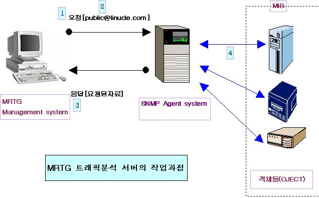 SNMPD 설치가 확인됐으면, MRTG 설치로 바로 넘어가도 된다. 아래는 SNMPD를 조금 더 실습하고자 한다면, 계속 진행한다. http://csl.changwon.ac.kr/cyberclasses/notes/mib2/ http://www.simpleweb.org/ietf/mibs/modules/html/?category=IETF&module=SNMPv2-MIB 기타 MIB를 알기 위해 위의 사이트를 확인하자. snmpwalk는 해당 MIB의 하위계층에 있는 모든 정보를 요청한다. 예를들어 system MIB의 하위 계층에 있는 모든 OID에 대한 정보를 요청하길 원한다면 아래와 같이 하면된다. 이게 가능한 이유는 snmpwalk가 정보를 요청하기 위해서 snmp메시지를 만들때 PDU타입을 GET NEXT를 사용하기 때문이다. [root@www snmp]# /web/snmp/bin/snmpwalk localhost -c public system SNMPv2-MIB::sysDescr.0 = STRING: Linux www.ikunsan.co.kr 2.6.32.26-175.fc12.i686.PAE #1 SMP Wed Dec 1 21:45:50 UTC 2010 i686 SNMPv2-MIB::sysObjectID.0 = OID: NET-SNMP-MIB::netSnmpAgentOIDs.10 DISMAN-EVENT-MIB::sysUpTimeInstance = Timeticks: (94948) 0:15:49.48 SNMPv2-MIB::sysContact.0 = STRING: leejinkwan@kunsan.ac.kr SNMPv2-MIB::sysName.0 = STRING: www.ikunsan.co.kr SNMPv2-MIB::sysLocation.0 = STRING: korea SNMPv2-MIB::sysORLastChange.0 = Timeticks: (8) 0:00:00.08 SNMPv2-MIB::sysORID.1 = OID: SNMP-MPD-MIB::snmpMPDMIBObjects.3.1.1 SNMPv2-MIB::sysORID.2 = OID: SNMP-USER-BASED-SM-MIB::usmMIBCompliance SNMPv2-MIB::sysORID.3 = OID: SNMP-FRAMEWORK-MIB::snmpFrameworkMIBCompliance SNMPv2-MIB::sysORID.4 = OID: SNMPv2-MIB::snmpMIB SNMPv2-MIB::sysORID.5 = OID: TCP-MIB::tcpMIB SNMPv2-MIB::sysORID.6 = OID: IP-MIB::ip SNMPv2-MIB::sysORID.7 = OID: UDP-MIB::udpMIB SNMPv2-MIB::sysORID.8 = OID: SNMP-VIEW-BASED-ACM-MIB::vacmBasicGroup SNMPv2-MIB::sysORID.9 = OID: SNMP-NOTIFICATION-MIB::snmpNotifyFullCompliance SNMPv2-MIB::sysORID.10 = OID: NOTIFICATION-LOG-MIB::notificationLogMIB SNMPv2-MIB::sysORDescr.1 = STRING: The MIB for Message Processing and Dispatching. SNMPv2-MIB::sysORDescr.2 = STRING: The MIB for Message Processing and Dispatching. SNMPv2-MIB::sysORDescr.3 = STRING: The SNMP Management Architecture MIB. SNMPv2-MIB::sysORDescr.4 = STRING: The MIB module for SNMPv2 entities SNMPv2-MIB::sysORDescr.5 = STRING: The MIB module for managing TCP implementations SNMPv2-MIB::sysORDescr.6 = STRING: The MIB module for managing IP and ICMP implementations SNMPv2-MIB::sysORDescr.7 = STRING: The MIB module for managing UDP implementations SNMPv2-MIB::sysORDescr.8 = STRING: View-based Access Control Model for SNMP. SNMPv2-MIB::sysORDescr.9 = STRING: The MIB modules for managing SNMP Notification, plus filtering. SNMPv2-MIB::sysORDescr.10 = STRING: The MIB module for logging SNMP Notifications. SNMPv2-MIB::sysORUpTime.1 = Timeticks: (6) 0:00:00.06 SNMPv2-MIB::sysORUpTime.2 = Timeticks: (7) 0:00:00.07 SNMPv2-MIB::sysORUpTime.3 = Timeticks: (7) 0:00:00.07 SNMPv2-MIB::sysORUpTime.4 = Timeticks: (7) 0:00:00.07 SNMPv2-MIB::sysORUpTime.5 = Timeticks: (7) 0:00:00.07 SNMPv2-MIB::sysORUpTime.6 = Timeticks: (7) 0:00:00.07 SNMPv2-MIB::sysORUpTime.7 = Timeticks: (7) 0:00:00.07 SNMPv2-MIB::sysORUpTime.8 = Timeticks: (7) 0:00:00.07 SNMPv2-MIB::sysORUpTime.9 = Timeticks: (8) 0:00:00.08 SNMPv2-MIB::sysORUpTime.10 = Timeticks: (8) 0:00:00.08 system하위의 모든 OID에 대한 정보를 얻어오고 있음을 확인할수 있다. 또한 다른 PC의 정보를 요청할 경우는 해당 PC의 port 161 UDP 번을 열어 주어야 한다 snmpgetnext는 snmpwalk의 기능 축소판정도로 볼수 있을것이다. 즉 MIB계층구조에서 현재 요청한 OID의 다음 OID의 정보를 가져온다. 예를들어 system.sysDescr.0에 대한 정보를 요청하면 다음 OID인 system.sysObjectID.0의 정보를 요청하게 될것이다. 이게 가능한 이유는 snmpwalk와 마찬가지로 내부적으로 GET NEXT를 이용하고 있기 때문이다. snmpwalk가 더이상 얻을수 없을때까지 OID를 요청하는것과 달리 snmpgetnext 바로다음의 OID만을 요청한다.