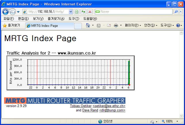 1) MRTG의 SNMP 매니저시스템에서 SNMP Agent 시스템에게 원하는 자료를 요청한다. (/web/mrtg/conf/****.cfg내의 ssCpuRawUser.0등과 같은 MIB값을 요청) 2) SNMP 에이젼트에 요청할 경우 보안을 위해 Community Name을 묻게 되며 community 권한으로 가능한 것들에 대한 것만 찾아서 응답해준다. (/web/snmp/share/snmp/snmpd.conf파일의 커뮤니티 이름에 대한 정보를 참조) 3) 각각의 객체은 각종 하드웨어와 장비의 정보를 가지고 있고 그것을 SNMP Agent에서 관리하고 있다가 정보를 전송하는 방식이다.(각각의 객체정보를 모아놓은 DB를 MIB(M info Base)라 한다) 4. MRTG cfg생성 및 분석 설치가 완료된 다음 해야 할 작업은 환경설정 단계이다. 환경설정을 위해서 mrtg.cfg 파일이 필요한데, 이 파일을 모두 수동으로 생성할 필요는 없다. /web/mrtg/bin 폴더에 보면 cfgmaker 유틸리티가 있다. 이 유틸리티를 사용해서 mrtg.cfg 파일을 생성해 보도록 하자. 옵션으로 사용되는 WorkDir은 웹서버로부터 접근이 가능한 위치여야 하며 IP 주소는 라우터의 IP주소이다. 가. mrtg cfg 파일 생성하기 : cfgmaker 명령 사용 [root@www mrtg-2.17.4]# mkdir /web/mrtg/conf [root@www mrtg-2.17.4]# cd /web/mrtg/conf 아래와 같이 하여 mrtg 설정 파일을 만든다. [root@www conf]# /web/mrtg/bin/cfgmaker --global "WorkDir: /web/httpd/htdocs/mrtg" --global "Options[_]:bits,growright" --output /web/mrtg/conf/mrtg.cfg public@localhost --base: Get Device Info on public@localhost: --base: Vendor Id: --base: Populating confcache --snpo: confcache public@localhost: Descr lo --> 1 --snpo: confcache public@localhost: Descr Intel Corporation 82540EM Gigabit Ethernet Controller --> 2 --snpo: confcache public@localhost: Ip 10.0.2.15 --> 2 --snpo: confcache public@localhost: Ip 127.0.0.1 --> 1 --snpo: confcache public@localhost: Name lo --> 1 --snpo: confcache public@localhost: Name eth0 --> 2 --snpo: confcache public@localhost: Type 24 --> 1 --snpo: confcache public@localhost: Type 6 --> 2 --snpo: confcache public@localhost: Eth --> 1 --snpo: confcache public@localhost: Eth 08-00-27-ed-3b-4a --> 2 --base: Get Interface Info --base: Walking ifIndex --base: Walking ifType --base: Walking ifAdminStatus --base: Walking ifOperStatus --base: Walking ifSpeed --base: Writing /web/mrtg/conf/mrtg.cfg 설정파일명은 각자 알아서 만든다. 여기서는 mrtg.cfg로 한다. [root@www conf]# /web/mrtg/bin/cfgmaker --global "WorkDir: /web/httpd/htdocs/mrtg" --global "Options[_]:bits,growright" --output /web/mrtg/conf/mrtg.cfg public@localhost:::::2 --base: Get Device Info on public@localhost:::::2 --base: Vendor Id: --base: Populating confcache --snpo: confcache public@localhost:::::2 Descr lo --> 1 --snpo: confcache public@localhost:::::2 Descr Intel Corporation 82540EM Gigabit Ethernet Controller --> 2 --snpo: confcache public@localhost:::::2 Ip 10.0.2.15 --> 2 --snpo: confcache public@localhost:::::2 Ip 127.0.0.1 --> 1 --snpo: confcache public@localhost:::::2 Name lo --> 1 --snpo: confcache public@localhost:::::2 Name eth0 --> 2 --snpo: confcache public@localhost:::::2 Type 24 --> 1 --snpo: confcache public@localhost:::::2 Type 6 --> 2 --snpo: confcache public@localhost:::::2 Eth --> 1 --snpo: confcache public@localhost:::::2 Eth 08-00-27-ed-3b-4a --> 2 --base: Get Interface Info --base: Walking ifIndex --base: Walking ifType --base: Walking ifAdminStatus --base: Walking ifOperStatus --base: Walking ifSpeed --base: Walking ifHighSpeed --base: snmpget public@localhost:::::2 for ifHighSpeed.1 -> 10 Mb/s --base: snmpget public@localhost:::::2 for ifHCInOctets.1 -> 437537 --base: snmpget public@localhost:::::2 for ifHighSpeed.2 -> 1000 Mb/s --base: snmpget public@localhost:::::2 for ifHCInOctets.2 -> 5599143 --base: Writing /web/mrtg/conf/mrtg.cfg public@localhost:::::2는 트래픽 정보를 수집하는 라우터에 관한 정보로 localhost는 라우터의 아이피나 호스트명, IP의 정보이며, public은 community를 통해 SNMP Request로 접근함을 의미한다. :::::2는 SNMP v2로 접근하는 것을 의미한다. 이제 MRTG를 실행해 보도록 하자. MRTG실행파일은 /web/mrtg/bin 디렉토에 mrtg라는 실행 파일이 있다. 이 명령을 실행하면 라우터로부터 데이터를 가져온 다음에 그래프를 생성하고 웹페이지를 만들어 준다. 매개 변수로 들어간 값은 mrtg 환경 설정 파일의 위치이다. 실행을 시키면 로그파일이 없다는 에러 메시지가 나오지만 이런 현상은 정상적인 에러 메시지이다. [root@www conf] mkdir /web/httpd/htdocs/mrtg MRTG에 의해 생성된 웹페이지들이 저장될 홈페이지 디렉토리에 mrtg라는 폴더를 만든다. [root@www conf]# env LANG=C /web/mrtg/bin/mrtg /web/mrtg/conf/mrtg.cfg Rateup WARNING: /web/mrtg/bin/rateup could not read the primary log file for localhost_2 Rateup WARNING: /web/mrtg/bin/rateup The backup log file for localhost_2 was invalid as well Rateup WARNING: /web/mrtg/bin/rateup Can't remove localhost_2.old updating log file Rateup WARNING: /web/mrtg/bin/rateup Can't rename localhost_2.log to localhost_2.old updating log file 실행 파일을 2번 실행할때까지 나오는 에러 메시지는 정상적이다. 메번 mrtg를 수동으로 실행한다는 것은 불가능하기 때문에 cron 데몬을 이용해서 5분에 한번 실행하도록 한다. /etc/crontab 파일에 스케줄링할 작업을 추가한다. 작업의 스케줄링 방법에 대해서 모른다면 crontab 명령에 대한 문서를 참고한다. 실행 명령을 추가하기 위해 아래와 같이 실행한다. [root@www mrtg]# useradd mrtg [root@www mrtg]# crontab -e */5 * * * * env LANG=C /web/mrtg/bin/mrtg /web/mrtg/conf/mrtg.cfg vi 에디터 사용법과 같다. 위와 같이 추가한다. MRTG를 반복적으로 실행하기 위해서는 CRONTAB이나 Run-Level