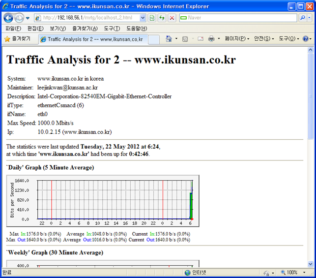 3. SNMP & MRTG 설치하기 1. net-snmp 소스 설치 참고사이트 : http://www.net-snmp.org/wiki/index.php/Tutorials 아래의 실습은 인터넷의 여러 사이트를 참고하였고, LeeLAB에서 실습에 맞게 재편집하였다. 가. SNMP 설치하기 기존에 설치된 rpm 패키지를 삭제한다. 아래 사이트에서 다운 받는다. http://sourceforge.net/projects/net-snmp/ 압축을 풀고, 아래와 같이 설치한다. [root@www snmp]# tar xvfz net-snmp-5.7.1.tar.gz [root@www snmp]# cd net-snmp-5.7.1 [root@www net-snmp-5.7.1]# ./configure --prefix=/web/snmp 생략 ************** Configuration Section ************** You are about to be prompted with a series of questions. Answer them carefully, as they determine how the SNMP agent and related applications are to function. After the configure script finishes, you can browse the newly created net-snmp-config.h file for further - less important - parameters to modify. Be careful if you re-run configure though, since net-snmp-config.h will be overwritten. -Press return to continue- [엔터] 생략 *** Default SNMP Version: 생략 Default version of SNMP to use (3): 2 [엔터] SNMP 버전을 지정한다. [1~3] 생략 *** System Contact Information: 생략 System Contact Information (@@no.where): leejinkwan@kunsan.ac.kr[엔터] 관리자 email주소를 지정한다. 생략 *** System Location: 생략 System Location (Unknown): korea[엔터] 주소를 지정한다. 생략 *** Logfile location: 생략 Location to write logfile (/var/log/snmpd.log):[엔터] 로그파일의 위치를 지정한다. 생략 *** snmpd persistent storage location: 생략 Location to write persistent information (/var/net-snmp):[엔터] 생략 --------------------------------------------------------- Net-SNMP configuration summary: --------------------------------------------------------- SNMP Versions Supported: 1 2c 3 Building for: linux Net-SNMP Version: 5.7.1 Network transport support: Callback Unix Alias TCP UDP IPv4Base SocketBase TCPBase UDPIPv4Base UDPBase SNMPv3 Security Modules: usm Agent MIB code: default_modules => snmpv3mibs mibII ucd_snmp notification notification-log-mib target agent_mibs agentx disman/event disman/schedule utilities host MYSQL Trap Logging: unavailable Embedded Perl support: disabled SNMP Perl modules: building -- not embeddable SNMP Python modules: disabled Crypto support from: crypto Authentication support: MD5 SHA1 Encryption support: DES AES Local DNSSEC validation: disabled --------------------------------------------------------- [root@www net-snmp-5.7.1]# [root@www net-snmp-5.7.1]# make && make install [root@www net-snmp-5.7.1]# cp EXAMPLE.conf /web/snmp/share/snmp/snmpd.conf 환경설정 파일은 snmpd.conf를 설치디렉토리에 EXAMPLE.conf를 복사하여 생성한다. 또는 아래와 같이 새로 snmpd.conf파일을 만들고, 아래 내용으로 복사하여 붙여넣기 한다. [root@www net-snmp-5.7.1]# cat /dev/null > /web/snmp/share/snmp/snmpd.conf [root@www net-snmp-5.7.1]# vi /web/snmp/share/snmp/snmpd.conf com2sec local 127.0.0.1 public com2sec mynetwork 0.0.0.0/0 public # public 는 community명으로 기본 설정은 public이며 임의의 단어로 설정이 가능하다. group MyRWGroup v1 local group MyRWGroup v2c local group MyRWGroup usm local group MyROGroup v1 mynetwork group MyROGroup v2c mynetwork group MyROGroup usm mynetwork view all included .1 #view all included .1 80 access MyROGroup "" any noauth exact all none none access MyRWGroup "" any noauth exact all all none # load ave # Load Average를 체크하기 위해 다음과 같이 설정합니다. load # disk used # 하드디스크의 사용량을 체크하기 위해 다음과 같이 설정합니다. disk / disk /var disk /home # -------------- 기존에 실행중인 snmpd 데몬을 종료하기 위해 아래와 같이 한다. [root@www snmp]# pkill snmpd 다음과 같이 다시 시작하자. [root@www snmp]# /web/snmp/sbin/snmpd 나. SNMP AGENT 실행 설치가 끝나면 agent와 manager프로그램이 모두 설치되어 있을 것이다. 그리고 여기에 더불어 개발자를 위한 각종 라이브러리와 헤더파일들도 설치된다. 이 라이브러리와 헤더파일들은 개발할때 필요하다. net-snmp는 agent 프로그램으로 snmpd를 제공한다. agent환경을 제대로 만들려면 복잡해보이는 설정파일을 만들어줘야 하지만 이것은 각자의 몫이다. net-snmp프로젝트 홈페이지에서 제공하는 메뉴얼을 참고하기 바란다. 어쨋든 현재로써는 단지 snmpd를 띄우는 정도로 snmp agent환경을 만들수 있다. [root@www root]# /web/snmp/sbin/snmpd