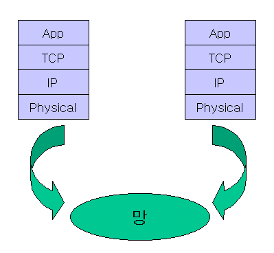 각각 하는 일이 모두 정해져 있긴 하지만, 그것들을 일일이 다 알아야 할 필요는 없을 것이다. 단지 통신이 이렇게 계층적으로 이루어진다는 것만 생각하자. TCP/IP는 4단계의 계층으로 이루어진다. 그럼, 이제 TCP/IP를 이용해 통신이 이루어지는 모습은 <그림4>에서 좀더 확실하게 나타나고 있다.