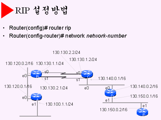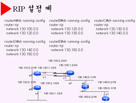 - RIP을 이용하는 네트웍에서 subnetwork number가 불연속적으로 할당되는 것은 피해야 한다. 즉 130.130.3.0/24를 라우터D와 라우터E의 interface ethernet1에 대한 network number로 할당하지 않아야 한다.