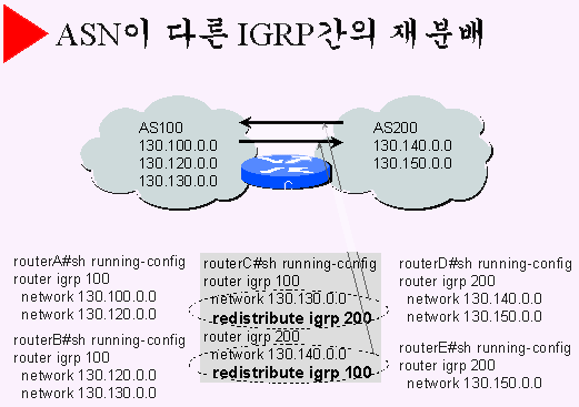 - router igrp 200의 ‘redistribute igrp 100’을 선언하지 않으면 AS200에 있는 라우터들은 AS100에 속한 네트웍에 대한 route information을 전달받지 못하게 된다.