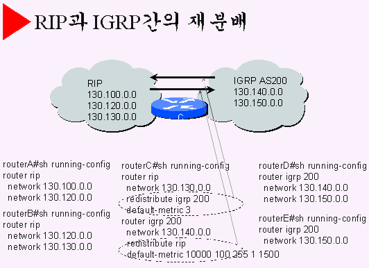 - router igrp 200에서 rip을 igrp로 재분배할때 default-metric을 설정하는 것은 ‘ASN이 다른 IGRP간의 재분배’에서 이미 설명하였다. igrp가 아닌 routing protocol을 igrp로 재분배할 때는 반드시 default-metric을 지정해야 한다.
