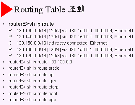 - 라우터E는 130.130.0.0에 대한 route 130.150.0.1(즉 라우터D)로부터 전달받았으며, 라우터D를 가려면 자신의 interface ethernet 1을 통하면 갈 수 있다.