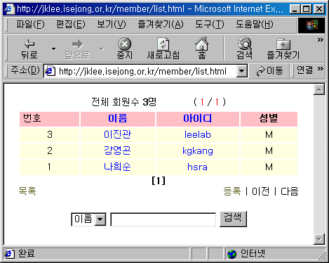 6. 세부사항보기(viewuser.html) - 검색기능 검색기능 추가에 따른 세부사항보기도 수정이 필요하다. 다시 목록으로 돌아가면, 검색기능에 포함된 기능은 없어진다.