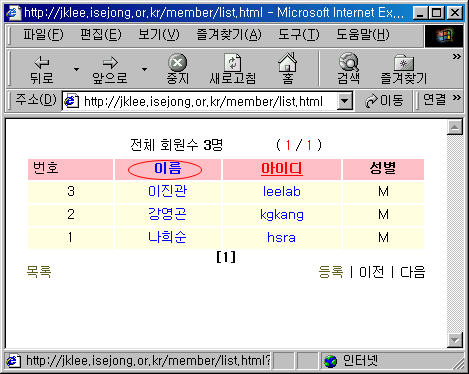 <table width=400 border=0 cellpadding=3 align=center> <tr> <? if(!$total_record) { echo("<td colspan=8 align=center>현재 등록되어 있는 사용자가 없습니다.</td>"); } else { ?> <td colspan=8 align=center>전체 회원수 <b><?echo("$total_record")?></b>명 <font size=2>( <font color="red"><? echo("$page") ?></font> / <font color="red"><? echo("$total_page") ?></font> )</font></td> <? } ?> </tr> <tr> <td bgColor=pink align="center" width=30>번호</td> <th bgColor=pink align=center><a href="list.html?order=name<?echo("&keyfield=$keyfield&key=$encoded_key");?>">이름</a></td> <th bgColor=pink align=center><a href="list.html?order=id<?echo("&keyfield=$keyfield&key=$encoded_key");?>">아이디</a></td> <th bgColor=pink align=center>성별</td> </tr>