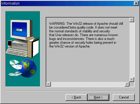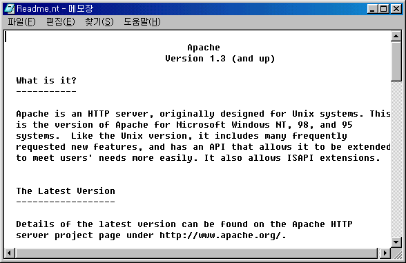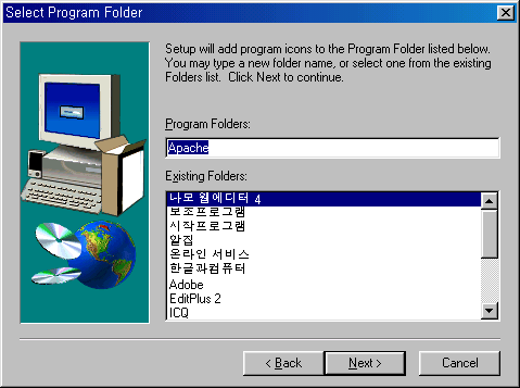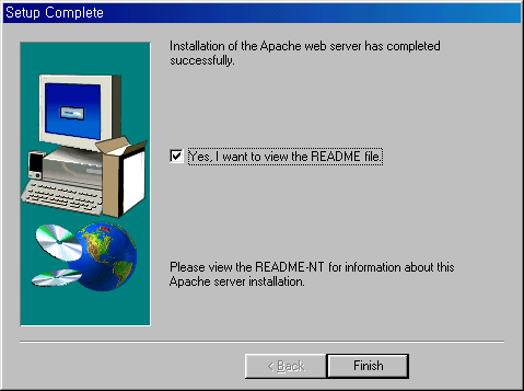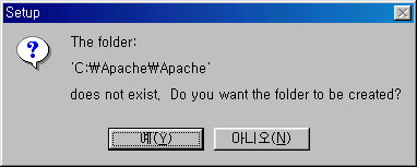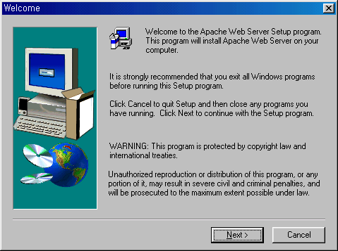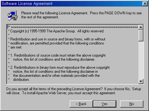 2. 아파치 웹서버 설치하기 apache_1_3_12_win32.exe를 다운로드 받고, 탐색기에서 더블클릭하여 실행하면 아래와 같이 설치된다.