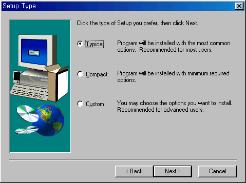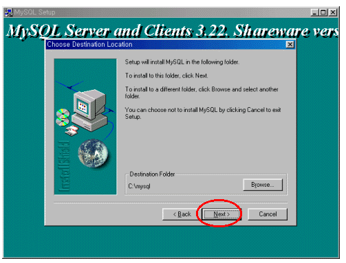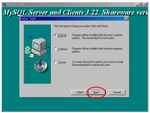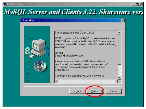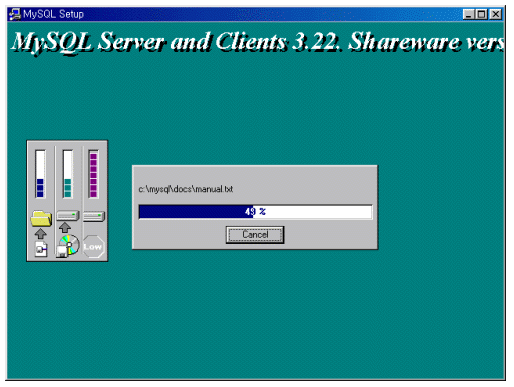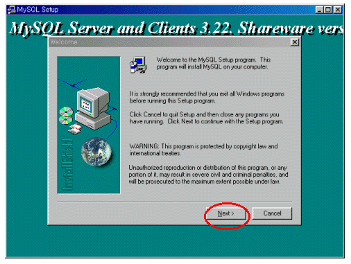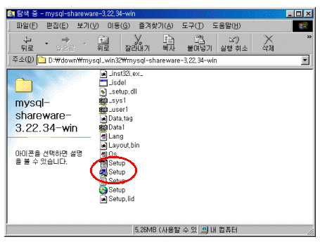 3. 윈도우용 Apache + PHP + MySQL 설치하기 1. MySQL 설치하기 윈도우용 MySQL의 버전은 3.23.39까지 나와있다. mysql싸이트에서 다운받거나 ftp.leelab.co.kr에서 다운받는다. 다운받은후 임시 디렉토리에서 압축을 풀고, setup을 실행하면 아래와 같은 설치화면이 나타난다.