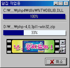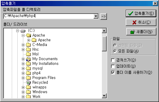 압축파일을 풀 디렉토리를 C:\Apache\php4로 입력한 후, 압축풀기 버튼을 클릭한다.