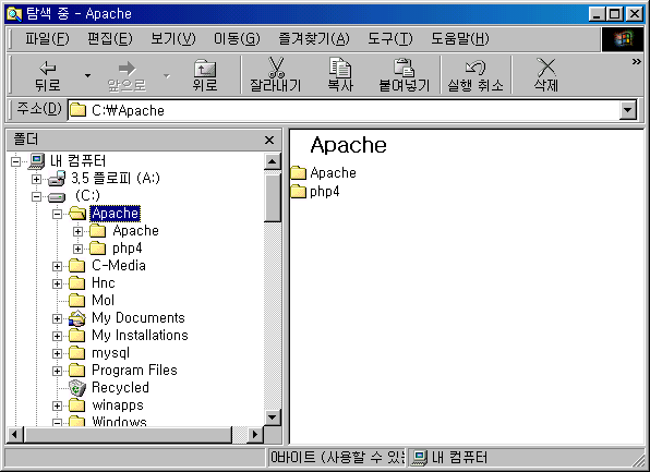 #AddType application/x-httpd-php3 .phtml 의 아래부분에 아래 내용을 추가한다. ScriptAlias /php/ "C:/Apache/PHP4/" Action application/x-httpd-php "/php/php.exe" ... 생략