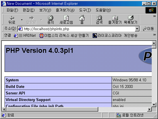 홈페이지의 홈디렉토리는 C:\Apache\Apache\htdocs디렉토리에 아래의 웹문서를 저장한 후, 아래와 같이 확인하면 된다. phpinfo.html <?