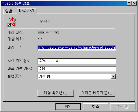 바탕화면에 있는 mysqld 바로가기 버튼에서 마우스 오른쪽하여, 등록정보를 클릭하면 아래와 같은 화면이 나온다.