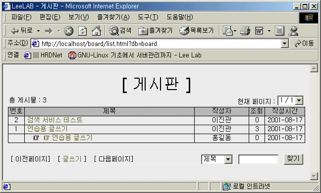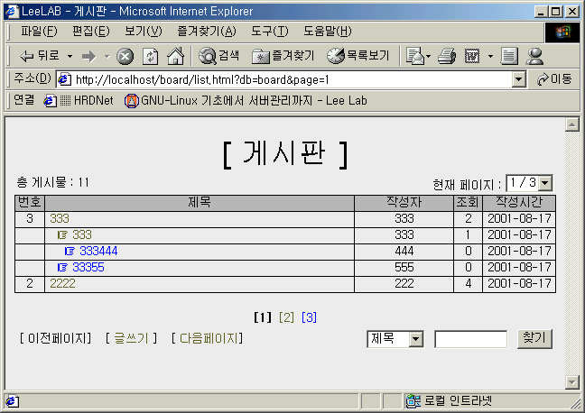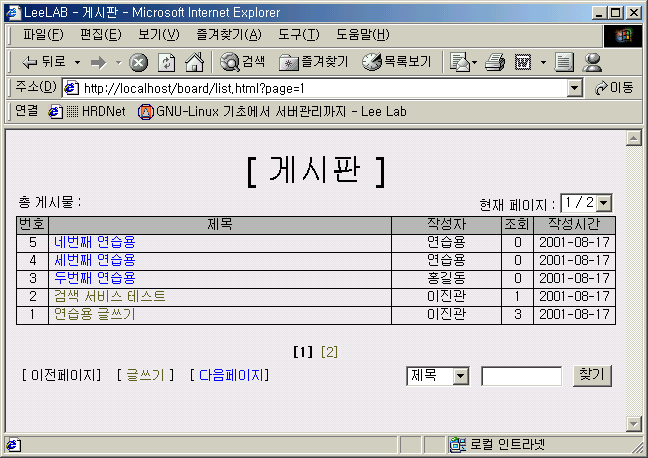 if($page > 1) echo "<A HREF='list.html?db=$db&page=$ppage'>이전페이지</A>"; else echo "이전페이지"; echo "] [ <A HREF='writeform.html?db=$db&page=$page'>글쓰기</A> ] [ "; if($page < $total_page) echo "<A HREF='list.html?db=$db&page=$npage'>다음페이지</A>"; else echo "다음페이지"; echo "]</TD> <FORM METHOD=POST ACTION=list.html?db=$db> <TD ALIGN=RIGHT><SELECT NAME=type> <OPTION VALUE='subject'>제목</OPTION> <OPTION VALUE='writer'>글쓴이</OPTION> <OPTION VALUE='content'>내용</OPTION></SELECT> <INPUT TYPE=TEXT NAME=keyword SIZE=10> <INPUT TYPE=SUBMIT VALUE='찾기'></TD> </FORM> </TR> </TABLE>";