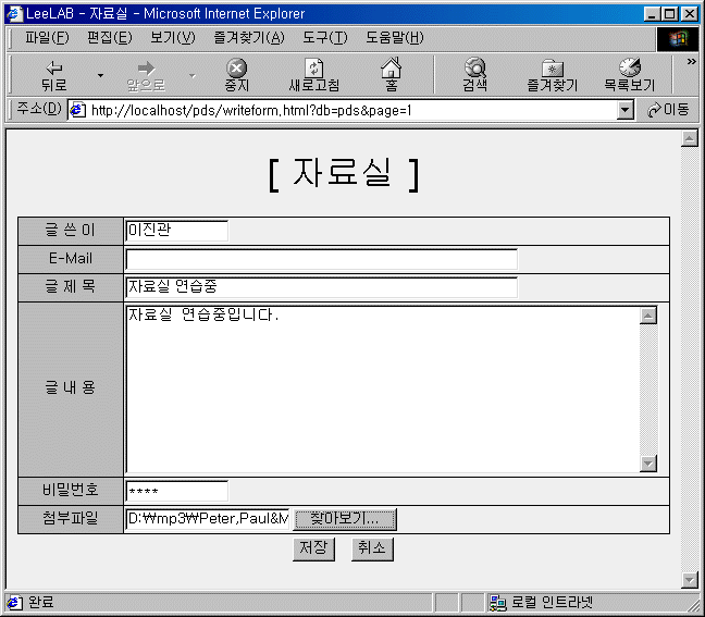 <SCRIPT LANGUAGE='javascript'> function chk_form() { if(document.signform.writer.value == '') alert('이름을 입력하여 주세요.'); else if(document.signform.subject.value == '') alert('제목을 입력하여 주세요'); else if(document.signform.content.value.length < 10) alert('내용을 성심껏 입력해주세요'); else if(document.signform.passwd.value == '') alert('비밀번호는 추후 글을 수정,삭제하는데 필요하니 입력해주세요.'); else document.signform.submit(); } </SCRIPT> </HEAD> <BODY BGCOLOR='eeeeee'> <CENTER> <FONT SIZE=6 FACE='Comic Sans MS'>[ 자료실 ]</FONT><BR> <FORM NAME='signform' METHOD=POST ACTION='write.html' ENCTYPE='multipart/form-data'> <TABLE WIDTH=600 BGCOLOR=black CELLSPACING=1> <TR> <TD BGCOLOR='bbbbbb' ALIGN=CENTER WIDTH=100><FONT SIZE=2 COLOR='black'>글 쓴 이</TD> <TD BGCOLOR='eeeeee' WIDTH=500><INPUT TYPE=TEXT NAME='writer' SIZE=12 MAXLENGTH=12></TD> </TR> <TR> <TD BGCOLOR='bbbbbb' ALIGN=CENTER WIDTH=100><FONT SIZE=2 COLOR='black'>E-Mail</TD> <TD BGCOLOR='eeeeee' WIDTH=500><INPUT TYPE=TEXT NAME='email' SIZE=50 MAXLENGTH=100></TD> </TR> <TR> <TD BGCOLOR='bbbbbb' ALIGN=CENTER WIDTH=100><FONT SIZE=2 COLOR='black'>글 제 목</TD> <TD BGCOLOR='eeeeee' WIDTH=500><INPUT TYPE=TEXT NAME='subject' SIZE=50 MAXLENGTH=100></TD> </TR> <TR> <TD BGCOLOR='bbbbbb' ALIGN=CENTER WIDTH=100><FONT SIZE=2 COLOR='black'>글 내 용</TD> <TD BGCOLOR='eeeeee' WIDTH=500><TEXTAREA NAME='content' ROWS=10 COLS=67></TEXTAREA></TD> </TR> <TR> <TD BGCOLOR='bbbbbb' ALIGN=CENTER WIDTH=100><FONT SIZE=2 COLOR='black'>비밀번호</TD> <TD BGCOLOR='eeeeee'><INPUT TYPE=PASSWORD NAME='passwd' SIZE=12 MAXLENGTH=12> </TR> <TR> <TD BGCOLOR='bbbbbb' ALIGN=CENTER WIDTH=100> <FONT SIZE=2 COLOR='black'>첨부파일</TD> <TD BGCOLOR='eeeeee'> <INPUT TYPE=FILE NAME=up_file></TD> </TR>