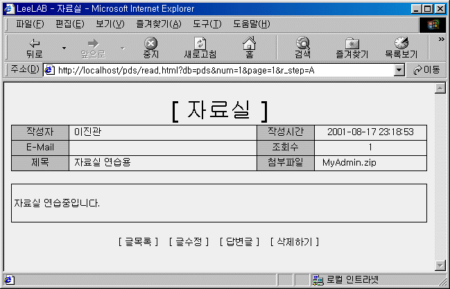 ?> <HEAD> <TITLE>LeeLAB - 자료실</TITLE> <STYLE TYPE='text/css'> <!-- A:link{text-decoration:none;color:} A:visited{text-decoration:none;color:} A:hover {background-color:dddddd} --> </STYLE>