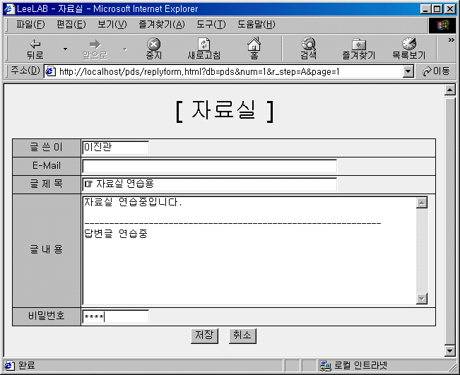 등록 폼 만들기(writeform.html) <HEAD> <TITLE>LeeLAB - 자료실</TITLE> <STYLE TYPE='text/css'> <!-- A:link{text-decoration:none;color:} A:visited{text-decoration:none;color:} A:hover {background-color:dddddd} --> </STYLE>