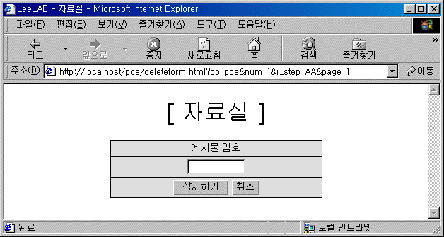 게시물 삭제 폼 만들기(deleteform.html) <HEAD> <TITLE>LeeLAB - 자료실</TITLE> <STYLE TYPE='text/css'> <!-- A:link{text-decoration:none;color:} A:visited{text-decoration:none;color:} A:hover {background-color:dddddd} --> </STYLE> </HEAD> <BODY> <CENTER> <FONT SIZE=6 FACE='Comic Sans MS'>[ 자료실 ]</FONT><BR>