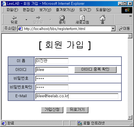 회원 가입 폼(registerform.html) <HTML> <HEAD> <TITLE>LeeLAB - 회원 가입</TITLE> <SCRIPT LANGUAGE='JavaScript'> function form_submit() { if(!document.registerform.name.value) { alert('이름을 입력하여 주세요.'); document.registerform.name.focus(); } else if(!document.registerform.id.value) { alert('아이디를 입력하여 주세요.'); document.registerform.id.focus(); } else if(!document.registerform.passwd.value) { alert('비밀번호를 입력하여 주세요.'); document.registerform.passwd.focus(); } else if(!document.registerform.passwd1.value) { alert('비밀번호를 확인하여 주세요.'); document.registerform.passwd1.focus(); } else if(document.registerform.passwd1.value != document.registerform.passwd.value) { alert('비밀번호 확인에 실패하였습니다. 다시 입력하여 주세요.'); document.registerform.passwd.value = ''; document.registerform.passwd1.value = ''; document.registerform.passwd.focus(); } else { document.registerform.submit(); } }