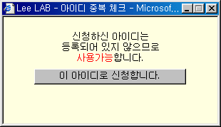 아이디 중복 처리 프로그램(check_id.html) <html> <head> <title>Lee LAB - 아이디 중복 체크</title> <meta http-equiv="Content-Type" content="text/html; charset=euc-kr">
