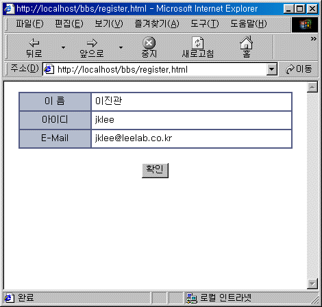</TABLE><br> <TABLE WIDTH=400> <TR> <TD ALIGN=CENTER><INPUT TYPE=BUTTON VALUE='확인' onclick='location=\"login.html\";'></TD> </TR> </TABLE>"; } ?>