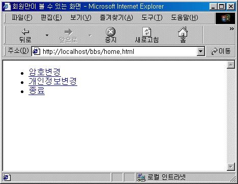 <BODY BGCOLOR="#FFFFFF"> <UL> <LI> <A HREF="passwd.html">암호변경</A> <LI> <A HREF="change.html">개인정보변경</A><br>
