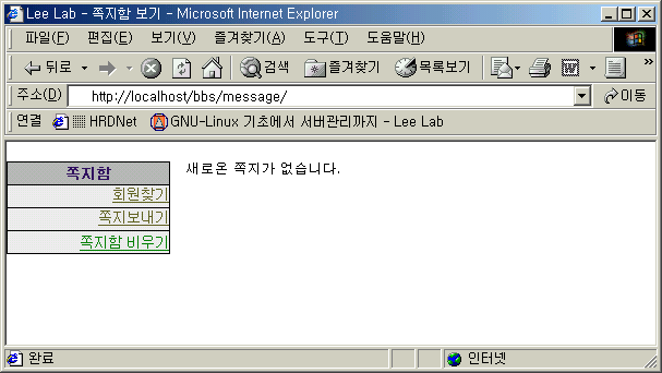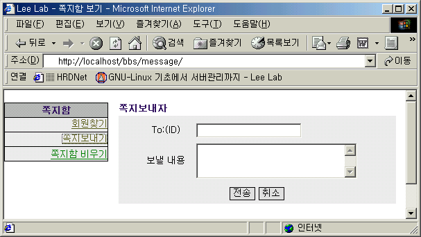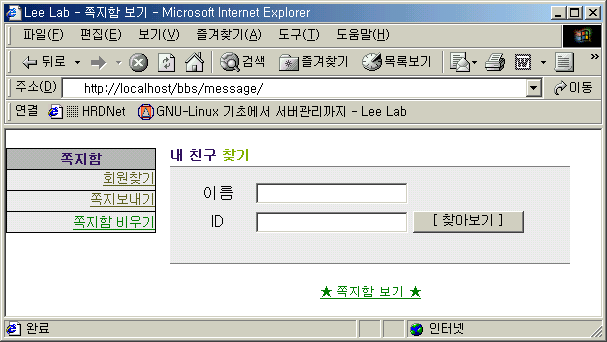 여기부터는 /bbs/message/ 디렉토리 밑에 파일을 만들면 됩니다. 파일명 : index.html <HTML> <HEAD> <TITLE> Lee Lab - 쪽지함 보기 </TITLE> </HEAD>