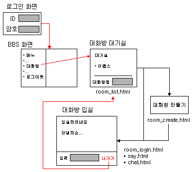 3. 대화방 만들기 디렉토리구조는 /bbs/chat/로서, 이 디렉토리 밑에 아래의 파일을 만들면 됩니다. 또한, BBS메뉴(/bbs/menu.html)에 대화방을 연결하면 됩니다. 파일명 : /bbs/menu.html <? if(!$user_id || !$user_name) { echo "<SCRIPT>location.replace('login.html');</SCRIPT>"; exit; } ?> <HTML> <HEAD> <TITLE> 회원만이 볼 수 있는 화면 </TITLE> </HEAD>